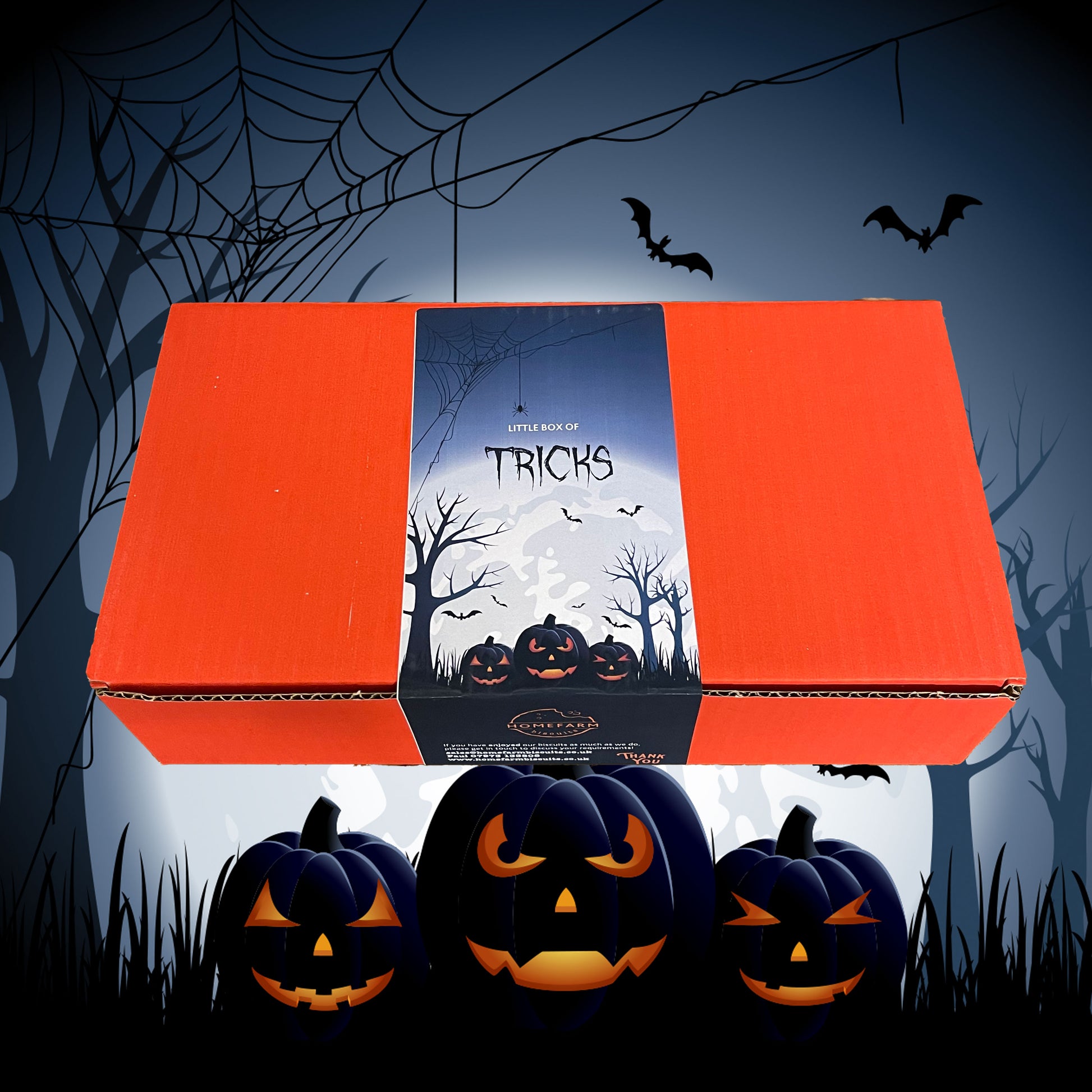 Gift hamper with 4 x 150g packs of scrumptious spooky biscuits. We've choosen Treacle, Orange Choc Chip Shortbread, Ginger Oaties and Cherry Amaretto.